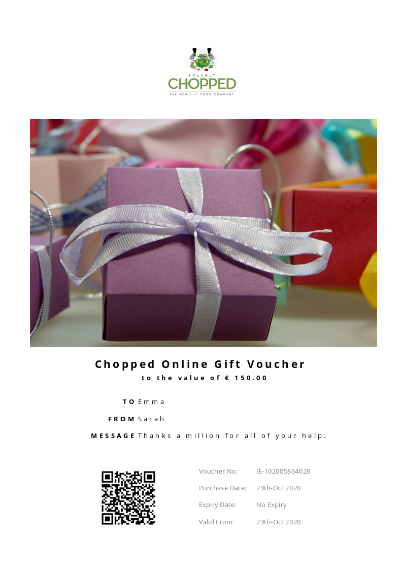 Chopped allows you to purchase instantly printable gift vouchers, special offers and tickets using the Voucher Connect platform.